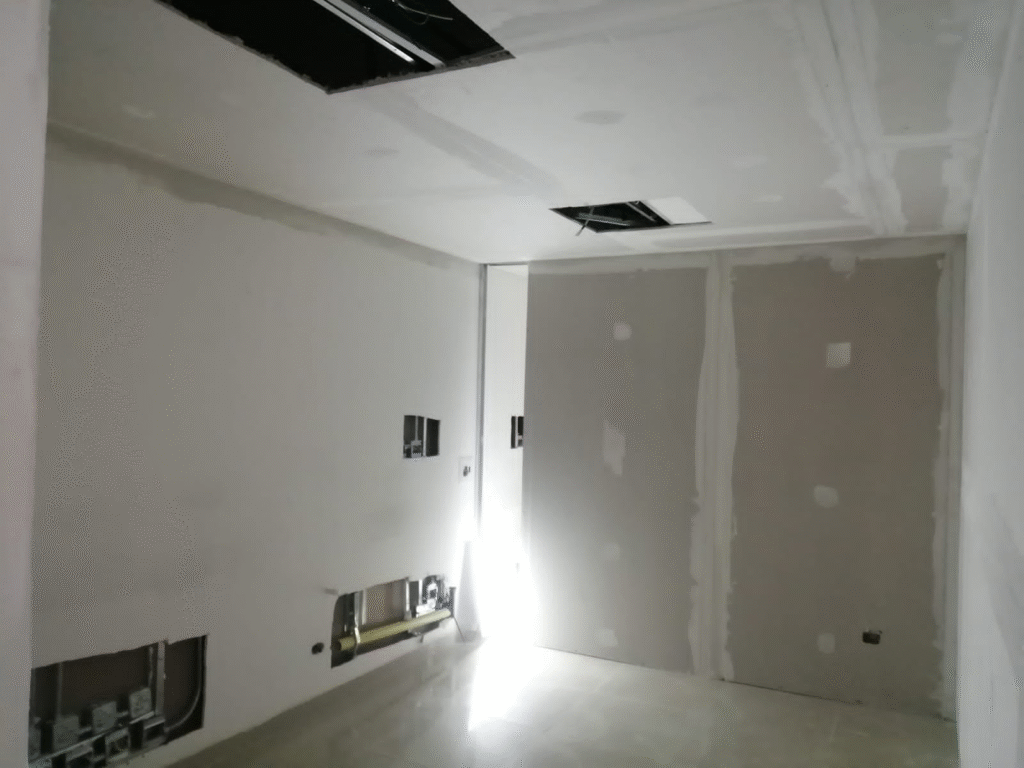Realizamos la instalación de paneles de yeso para crear nuevas divisiones y mejorar la acústica del espacio. Usamos materiales de alta calidad y técnicas modernas de construcción liviana. El resultado fue una oficina funcional, moderna y lista para operar.